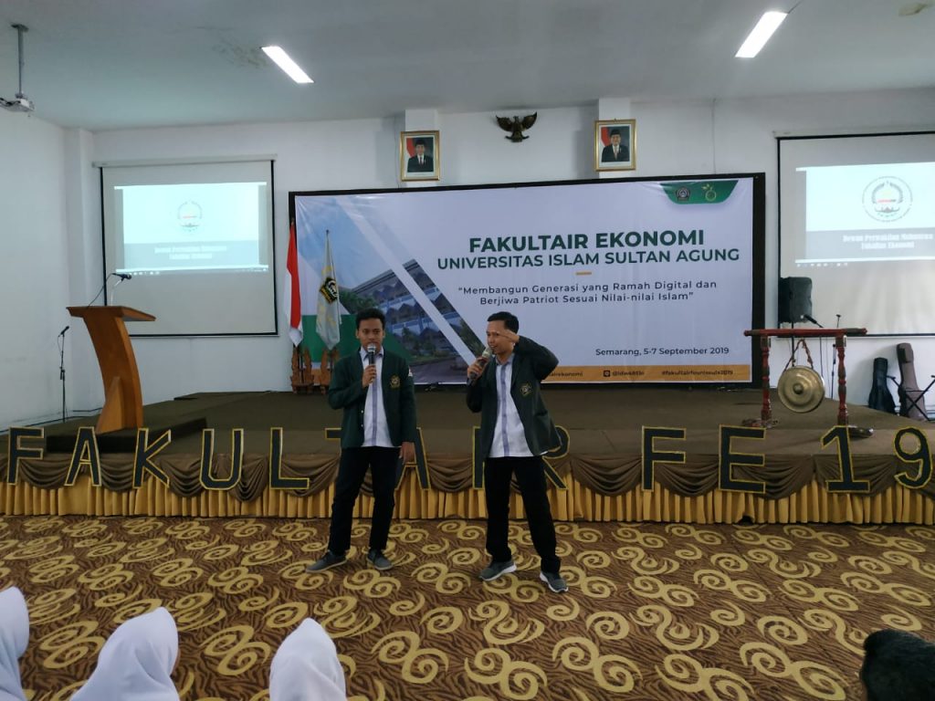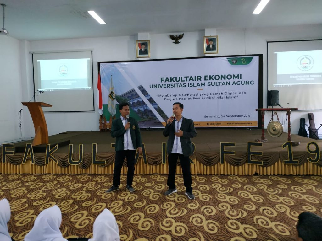 Ketua Lia Indra Setiawan dan Wakil Ketua Ahmad Ahda Autadi Dewan Perwakilan Mahasiswa Fakultas Ekonomi Unissula (DPM FE UNISSULA) memperkenalkan serta memberikan materi singkat seputar legislatif kepada mahasiswa baru FE Unissula pada kegiatan Fakultair. (5/11/2019)